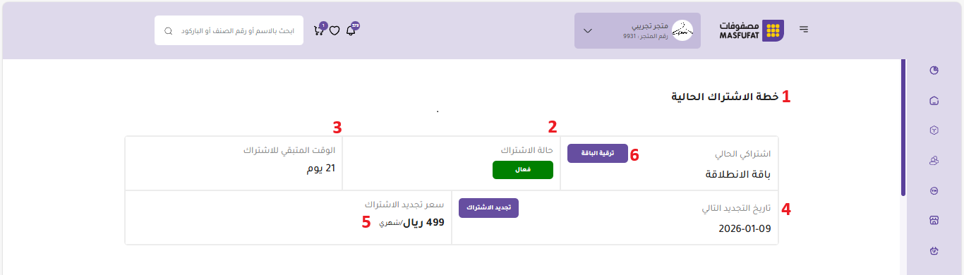 تستهل صفحة "اشتراكي" مهمتها بتقديم نظرة واضحة ومباشرة على حالة الاشتراك الحالية، مما يضمن للتاجرمعرفة موقفه بدقة في أي وقت. وتضم المعلومات التالية: