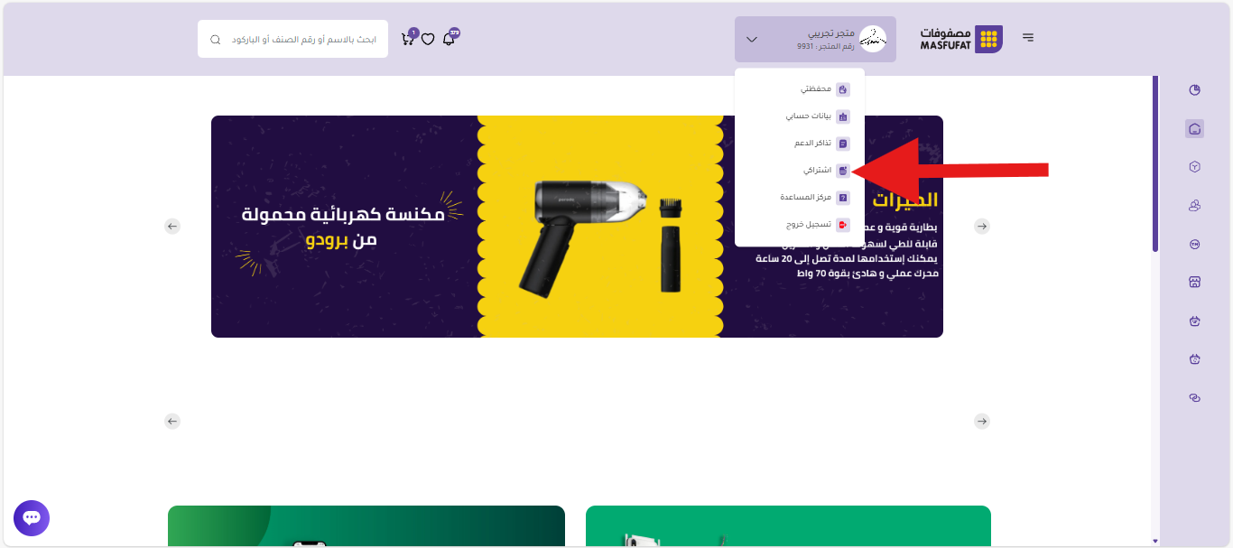 بدايةً، يمكنك الوصول إلى صفحة اشتراكي خلال القائمة المندرجة تحت شعر المتجر واسم ورقمه في لوحة تحكم التاجر (الرئيسية).