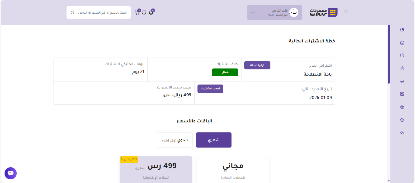 يُعرض في هذا القسم اسم الباقة الحالية التي اشترك فيها التاجر. هذه المعلومة هي الأساس الذي تنبني عليه كافة الميزات والخدمات المتاحة للمشترك، مما يتيح له التأكد من توافق الباقة مع احتياجاته.
