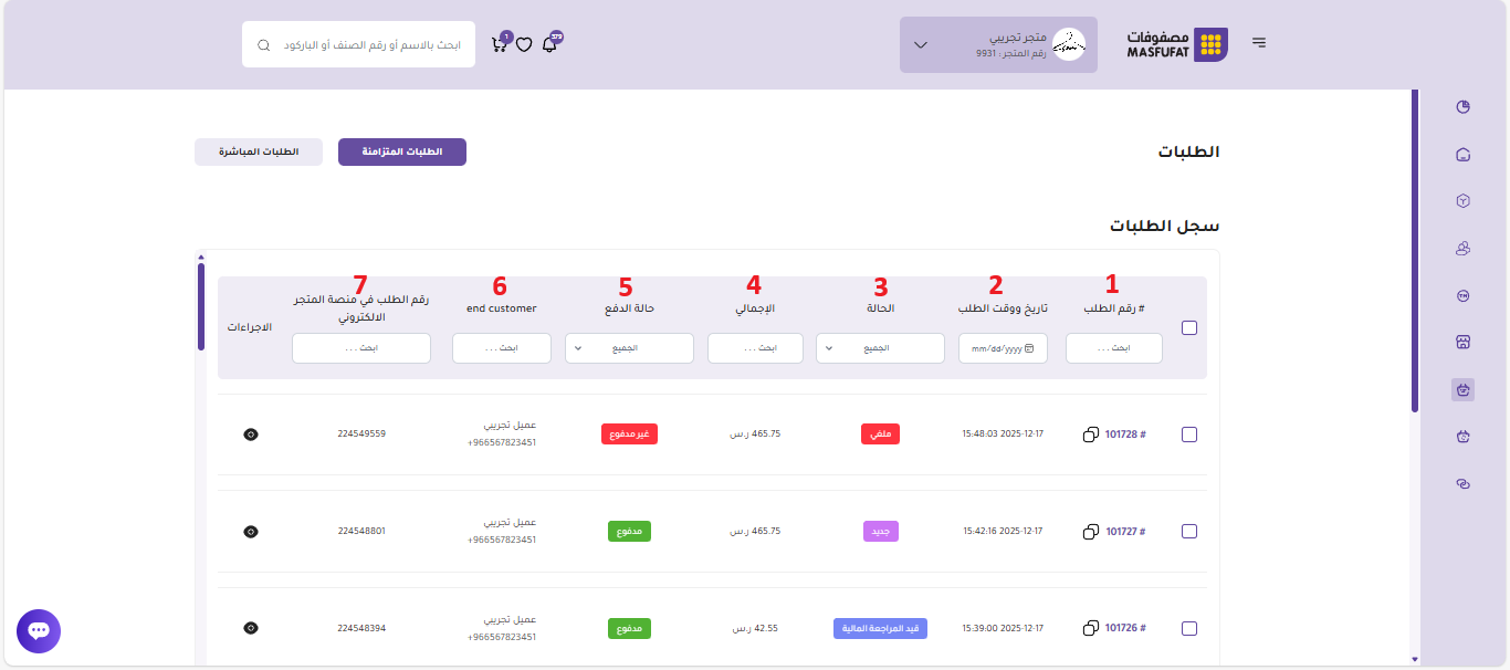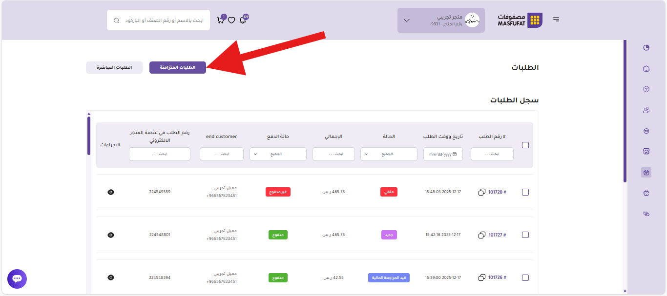 تُقدم صفحة الطلبات المتزامنة لوحة تحكم مركزية تُمكن التاجر من متابعة جميع الطلبات المتدفقة من متجره. يتم عرض هذه الطلبات في جدول تفصيلي، تتيح أعمدته نظرة سريعة وشاملة على حالة كل طلب. وهي كالتالي: