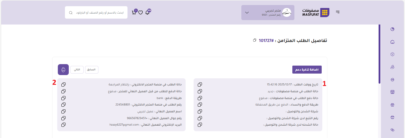 • حالة الطلب وحالة الدفع كما هي في المتجر الإلكتروني.