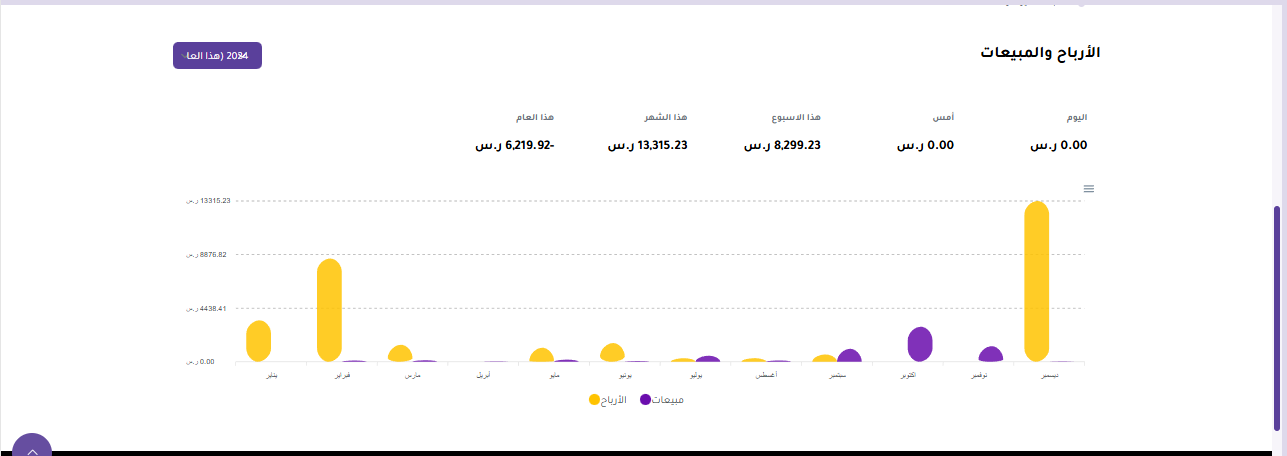 بالإضافة إلى الأرقام الإجمالية، تُخصص صفحة النظرة العامة قسم لإحصائيات الأرباح والمبيعات لمتجرك على منصة مصفوفات. هذا القسم هو بمثابة تقرير مالي مصغر، حيث يجمع بين إجمالي المبيعات وإجمالي الأرباح، ويقدمها في سياق تحليلي يسمح لك بمراقبة الأداء المالي على فترات زمنية مختلفة.
