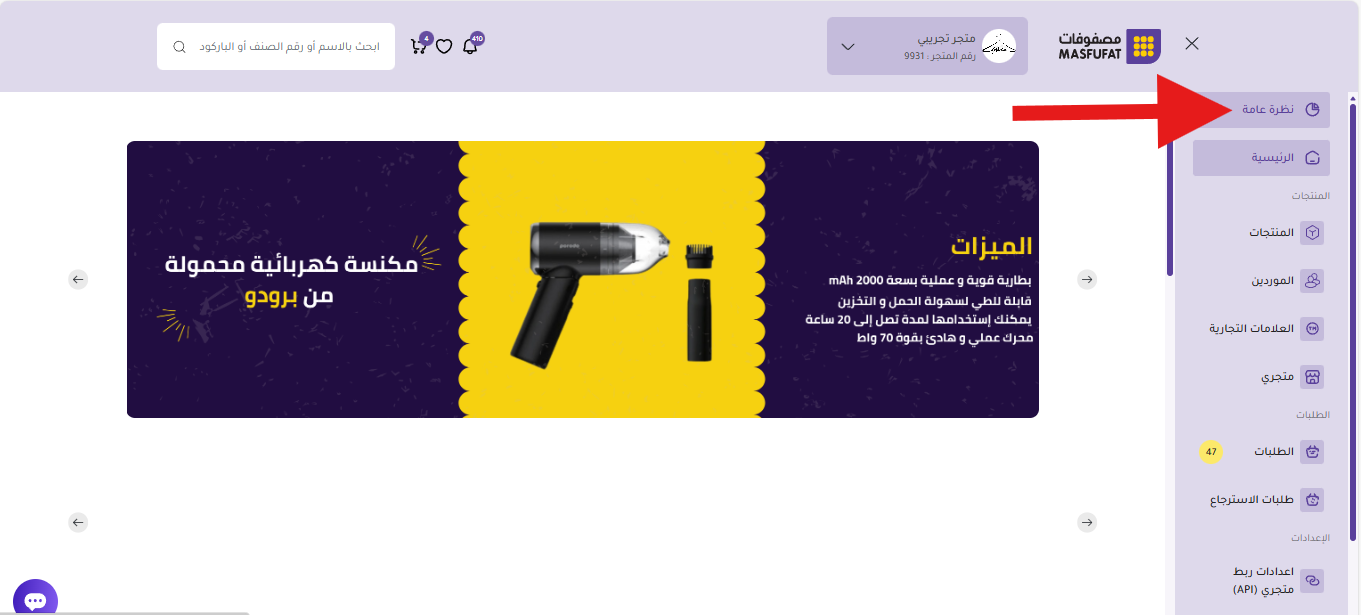 بدايةً، يمكنك الوصول إلى صفحة النظرة العامة خلال التبويبات الجانبية في لوحة تحكم التاجر (الرئيسية).