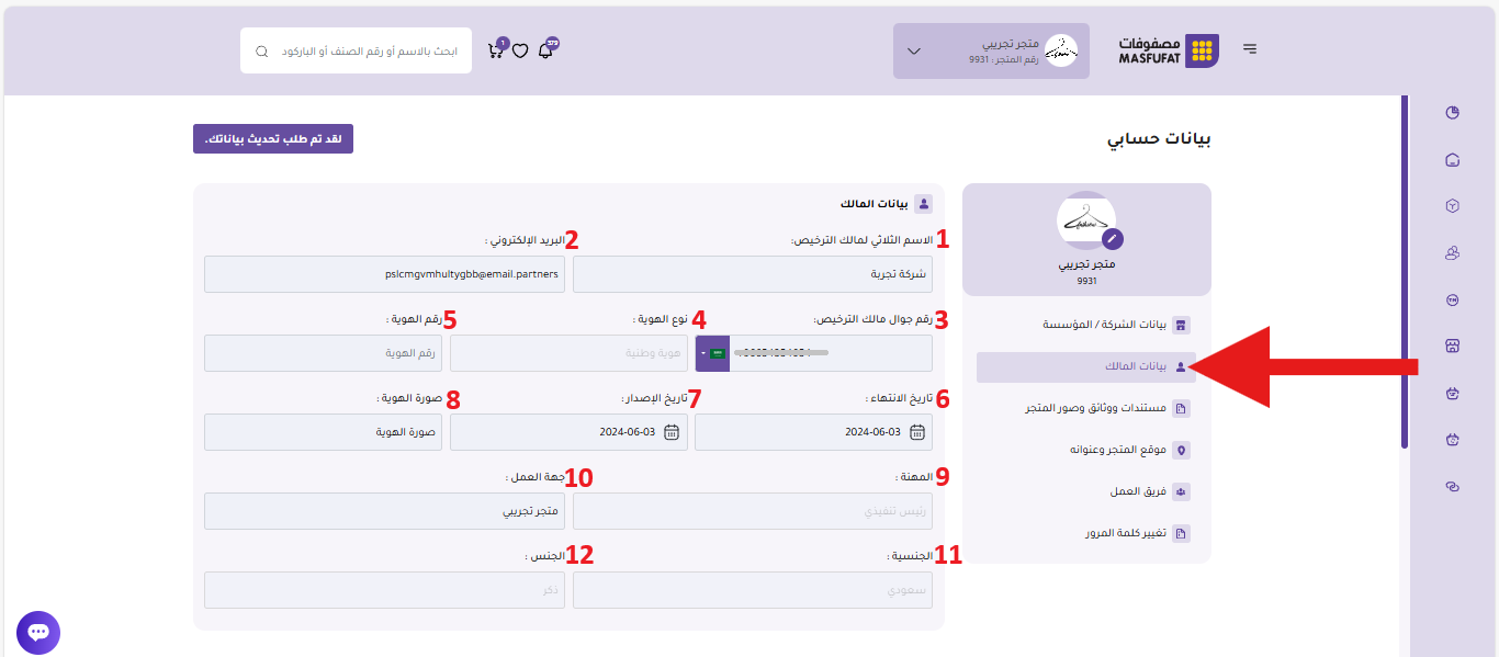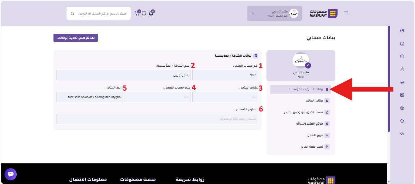 تُعد صفحة "بيانات حسابي" في منصة مصفوفات هي أساس دقة واكتمال المعلومات الأساسية لشركتك أو مؤسستك ومالكها. وإن تحديث هذه البيانات والتحقق من صحتها ليس مجرد إجراء روتيني، بل هو خطوة أساسية لضمان لدقة الدقة المعلومات، وتسهيل التواصل الفعّال، وضمان استمرارية الخدمات المقدمة لمتجرك الإلكتروني.