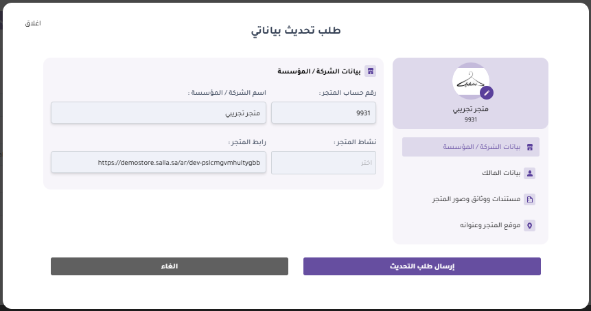(نافذة تحديث لتبويب بيانات الشركة/ المؤسسة)