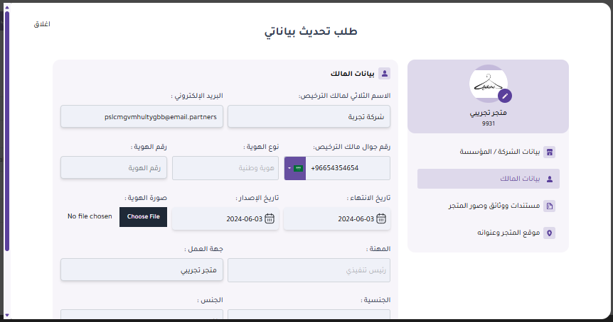 يُعد هذا التبويب بالغ الأهمية، حيث يضم البيانات الشخصية لمالك الترخيص (سواء كان سجل تجاري أو وثيقة عمل حر)، وهي معلومات ضرورية لأغراض توثيق بيانات المتجر.