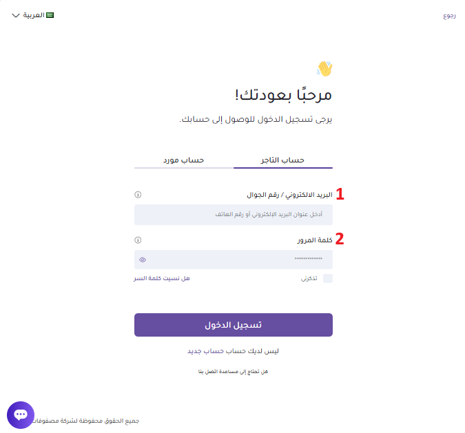 خُصِص خيار الدخول للتجار الذين أنشاؤوا مسبقًا حساب على منصة مصفوفات. للدخول إلى لوحة تحكم التاجر، اتبع الخطوات التالية: