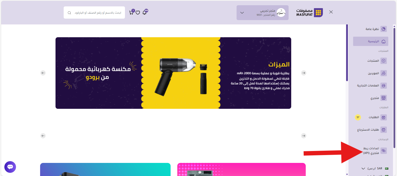 بدايةً، يمكنك الوصول لإعدادات ربط متجري (API) من خلال التبويبات الجانبية في لوحة تحكم التاجر (الرئيسية).