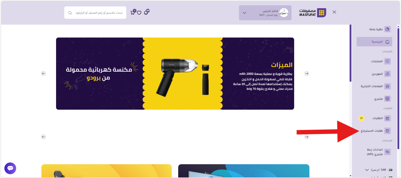 بدايةً، يمكنك الوصول إلى صفحة طلبات الاسترجاع خلال التبويبات الجانبية في لوحة تحكم التاجر (الرئيسية).