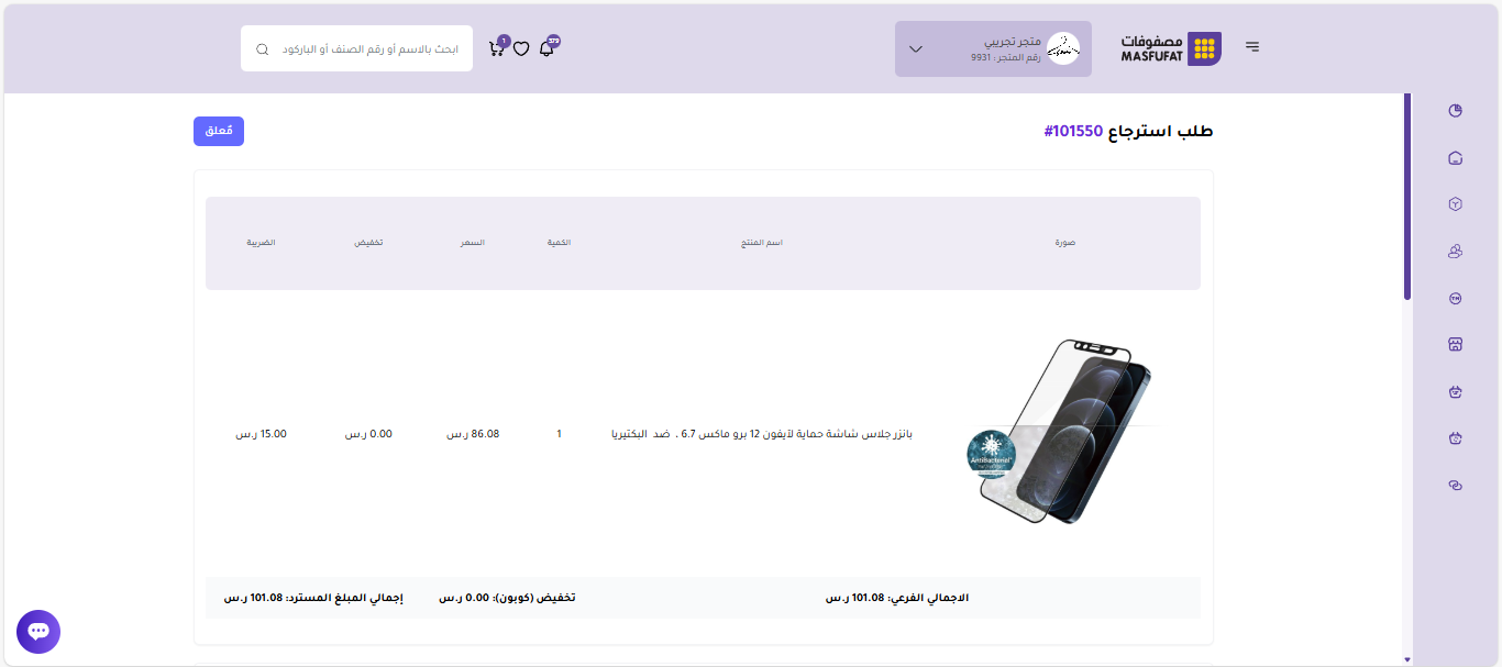 5. الإجمالي: يقصد به إجمالي المبلغ للمنتجات في طلب الاسترجاع.