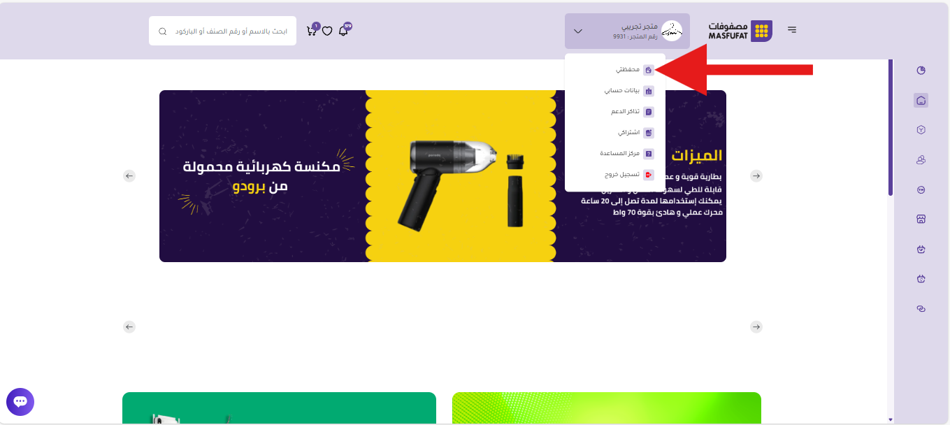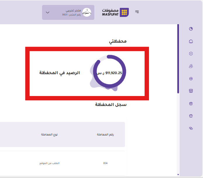 بدايةً، يمكنك الوصول إلى صفحة محفظتي خلال القائمة المندرجة تحت شعر المتجر واسم ورقمه في لوحة تحكم التاجر (الرئيسية).
