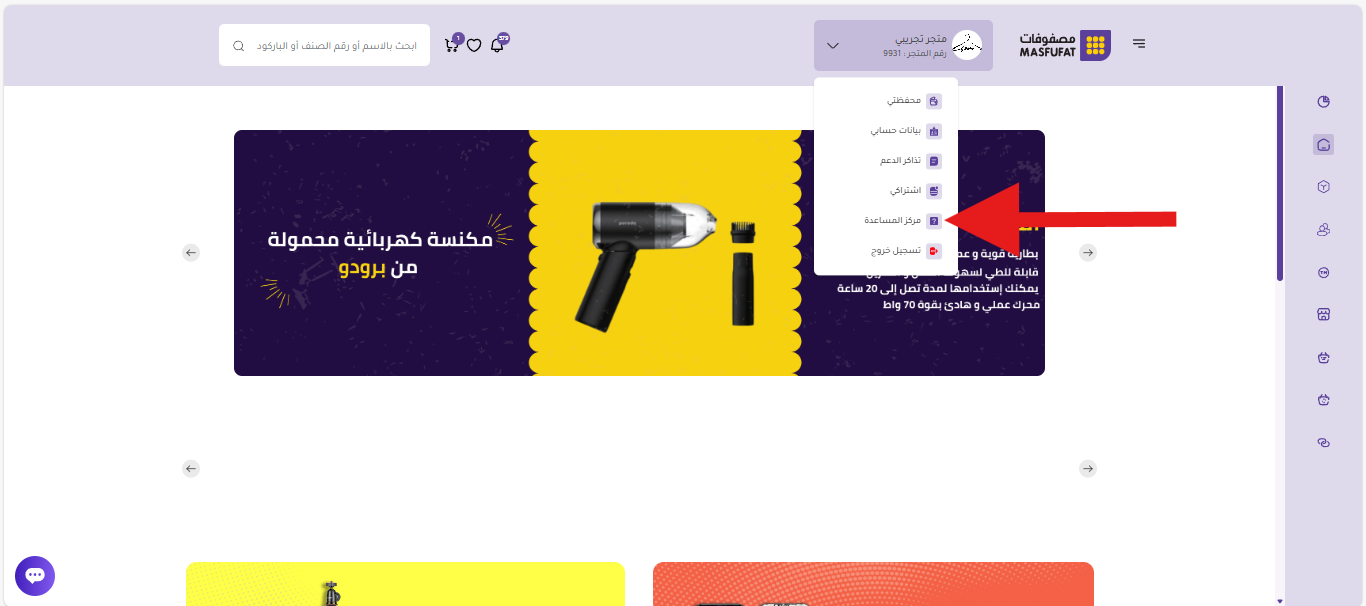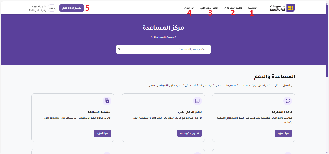 بدايةً، يمكنك الوصول إلى صفحة مركز المساعدة خلال القائمة المندرجة تحت شعر المتجر واسم ورقمه في لوحة تحكم التاجر (الرئيسية).