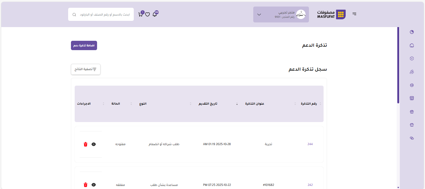 للمستخدمين الذين لديهم استفسارات أو مشكلات تتطلب متابعة مباشرة، يوفر هذا الخيار وصولاً سريعًا إلى صفحة تذاكر الدعم الخاصة بالمتجر. عند الضغط عليها، ينتقل المستخدم مباشرة إلى واجهة إدارة التذاكر، حيث يمكنه متابعة حالة تذاكره المفتوحة، والاطلاع على الردود، والتفاعل مع فريق الدعم الفني.