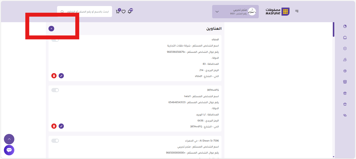 يُقصد بـ "العناوين" هنا عناوين الشحن الخاصة بالتاجر، وهي ضرورية لتسهيل عملية استلام الشحنات من قبل شركات النقل. ولإضافة موقع شحن جديد، يجب اتباع الخطوات التالية: