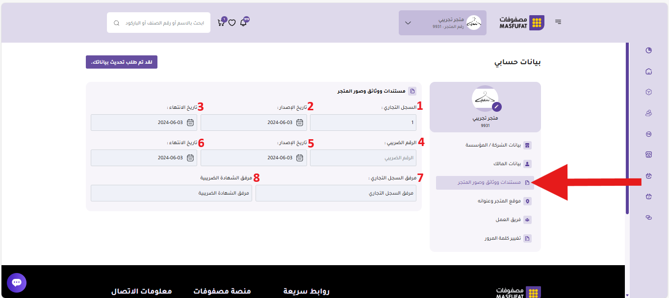 بدايةً، يمكنك الوصول إلى صفحة بياناتي خلال القائمة المندرجة تحت شعر المتجر واسم ورقمه في لوحة تحكم التاجر (الرئيسية).