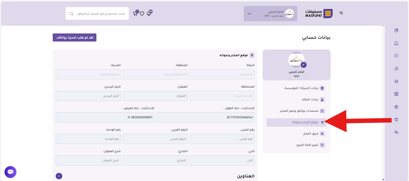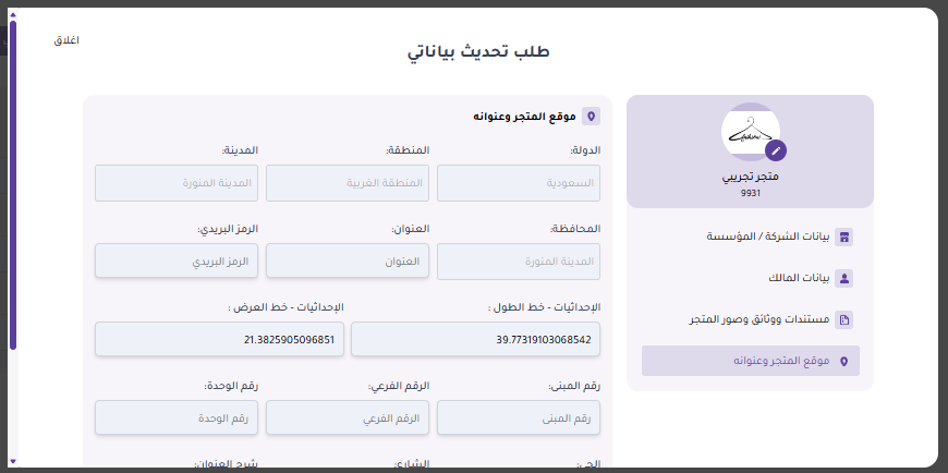 (نافذة تحديث البيانات لتبويب موقع المتجر وعنوانه)