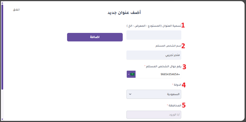 1. تسمية العنوان: اسم وصفي للعنوان (مثل: مستودع الرياض، معرض جدة) لتسهيل التعرف عليه.
