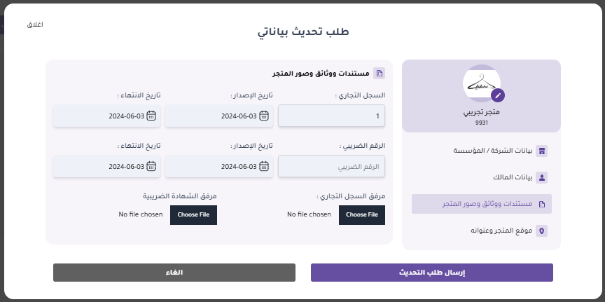 (نافذة تحديث البيانات لتبويب مستندات ووثائق وصور المتجر)